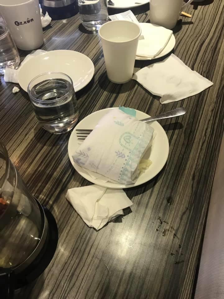 ▼從她上傳的照片可以清楚看到桌上有散落的餐盤和衛生紙,白色盤子上面竟然還有使用過的尿布!鐵叉也直接被壓在底下,讓人看得很不舒服。