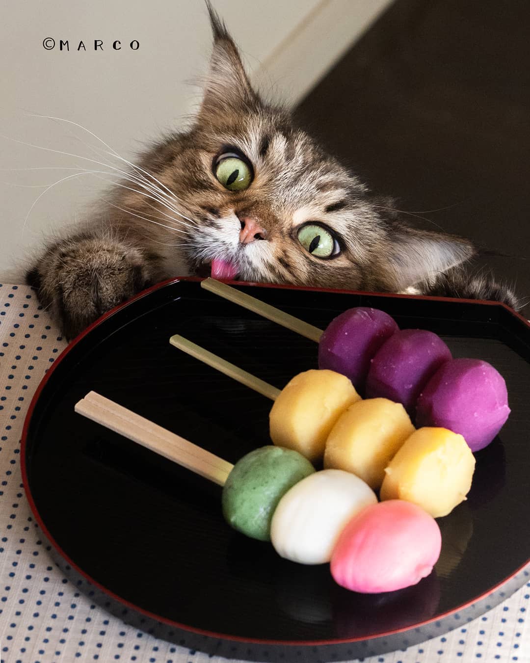 ▼「這就是人類都愛吃的糰子嗎?不同顏色有不同的味道嗎?」
