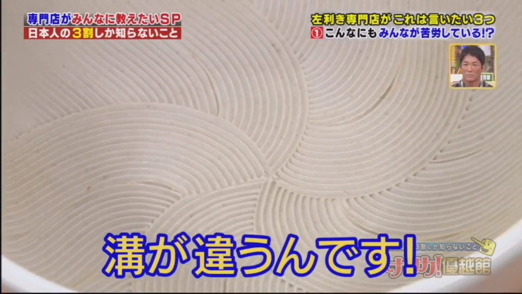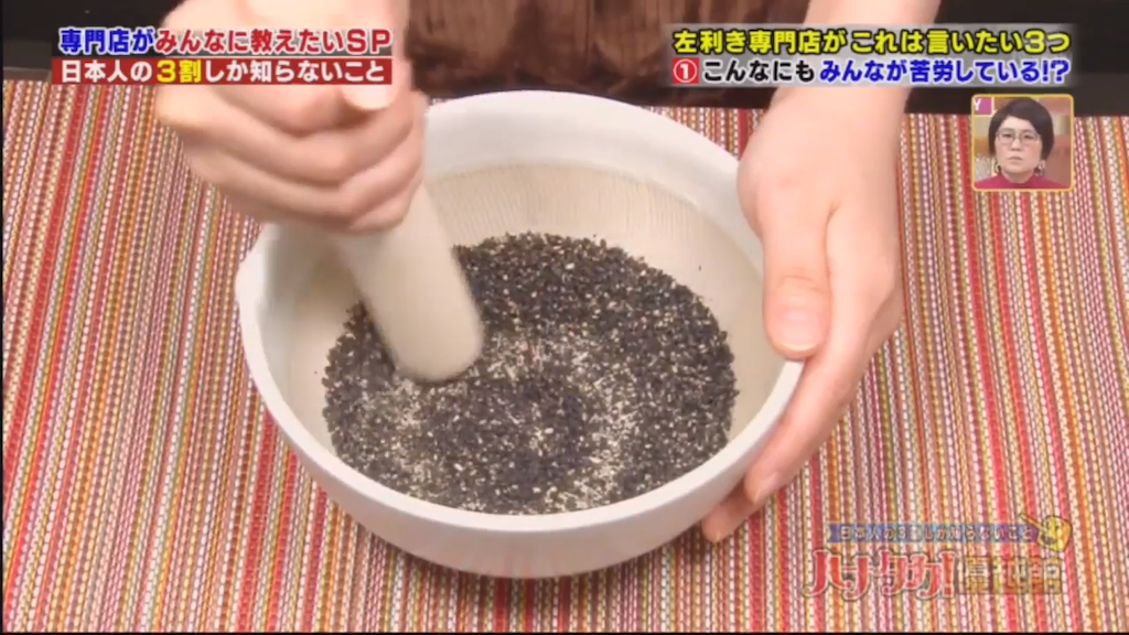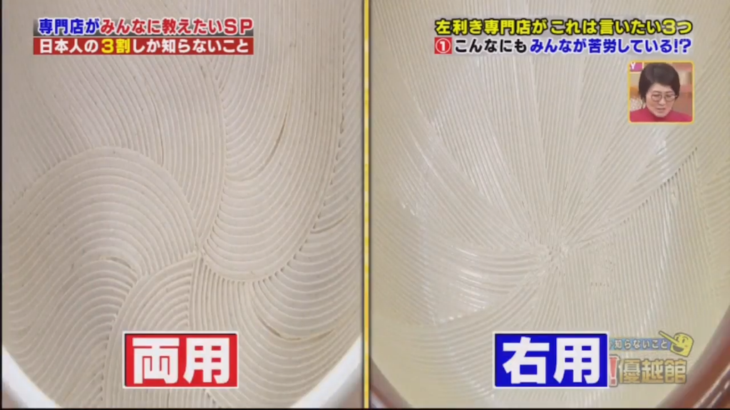 ▼節目介紹了各種左撇子生活中常遇到的障礙,而這些麻煩其實也都有相對應的商品可以克服:像是大家可能不知道,豬排店常見用來磨芝麻的碗,其實也是以「右撇子本位」去設計的,左撇子們用起來總是會卡卡…