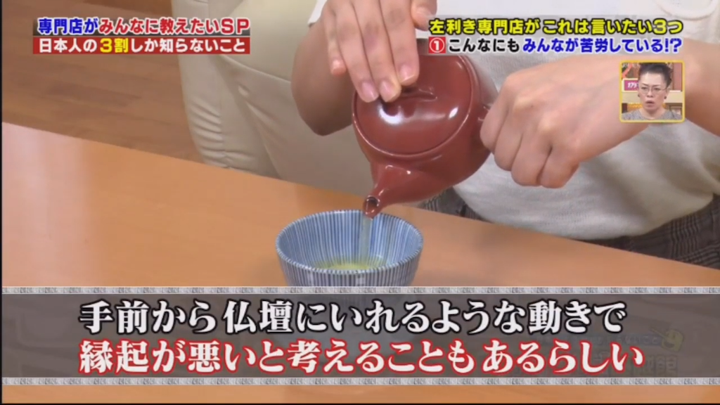 ▼如果左撇子用一般的款式,就要整個以很彆扭的pose把茶往外倒,操作一整個超艱困;而且因為這種倒茶的方式在日本是為佛壇添茶的,也有人認為這樣很不禮貌。