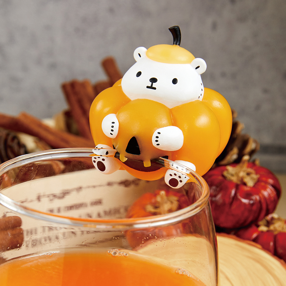 ▼本來就已經圓滾滾的白白,塞進南瓜裡,一整個更肥滿了,讓人超想咬一口。白白雙手遮住南瓜雙眼,看起來就像是在跟南瓜玩「猜猜我是誰」的遊戲一樣,用南瓜的兩顆牙掛在杯緣,這造型很欠揍。
