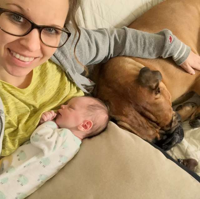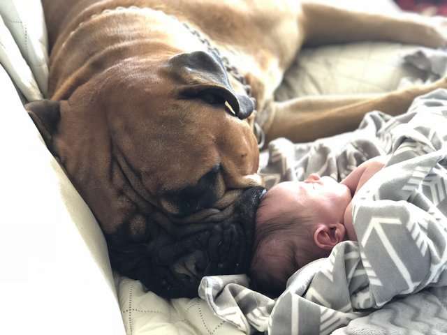 ▼在波妮生產時,布魯圖斯被寄放在家人那裡,等到凱登出生,波妮才讓他們兩個碰面。波妮本來還想介紹兩人「認識」,但布魯圖斯似乎立刻知道這是她小孩,「牠繞過我丈夫,想親吻凱登,想依偎在他身旁。」
