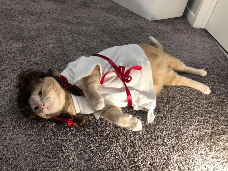 胖橘貓萬聖節要穿「安娜貝爾裝」 表情超有戲讓網友笑:怕怕餒~