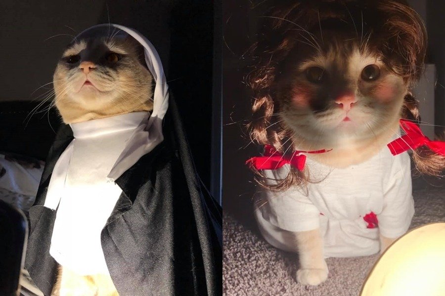 哪怕把貓咪打扮成安娜貝爾,再搭配陰森的氣氛,大家也不覺得害怕,因為牠真的太可愛啦~