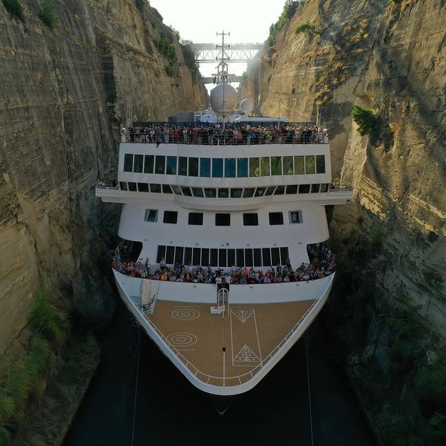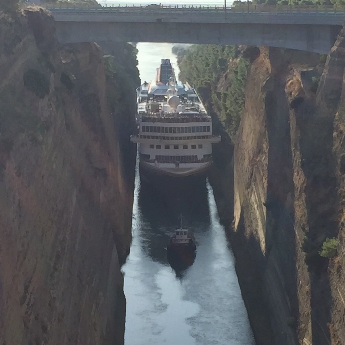 大家聽說過科林斯運河嗎?這是橫穿希臘科林斯地峽的一條運河,水面只有24公尺寬。因為太窄了,只有很小的船隻才能從這裡通過。今年9月,一艘巨大的郵輪成功穿越科林斯運河,創造了新的世界紀錄~