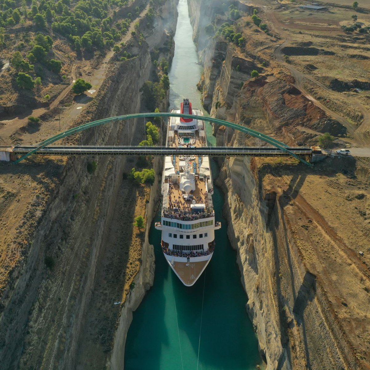 巨大遊輪穿過狹窄運河,確實是很寶貴的體驗。Fred.Olsen計劃2021年4月進行第2次穿越科林斯運河的航程。有人要去體驗心跳的感覺嗎?