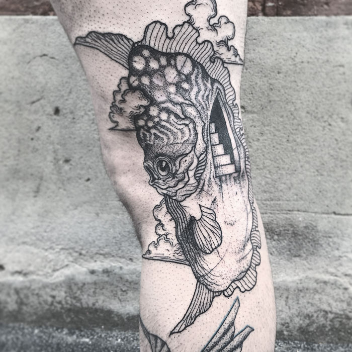 ▼法國刺青師傅 Vek Van Hilik 就是這一類刺青的佼佼者,他設計出了許多在肢體彎曲與伸展時會有不同刺青圖像。