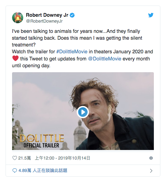 「鋼鐵人」小勞勃道尼 (Robert Downey Jr.)結束了漫威電影宇宙的演出後,他很快就又要有新作品《怪醫杜立德》(Doctor Dolittle)上映了!小勞勃道尼從鋼鐵人退休後,竟然學會了跟動物說話的能力?!