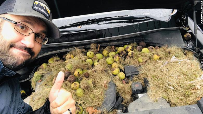 ▼原來克里斯在匹茲堡的住家後院,種植了一顆核桃樹,而他們平常停車的地方也距離核桃樹不遠。今天他們才發現掉落的核桃減少了許多,看來是這些松鼠將撿到的核桃直接塞進停放在附近的汽車引擎蓋下了!