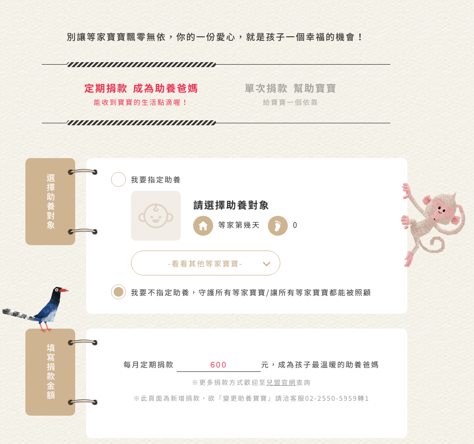 兒童福利聯盟基金會已經幫助過上千名兒童,但是還是有很多寶寶需要獲得幫助。如果覺得無力擔任這些等家寶寶一輩子的爸媽,也可以每個月捐助600元擔任助養爸媽喔!你的任何幫助都很有影響力,可以讓等家寶寶安心等到一個新家!