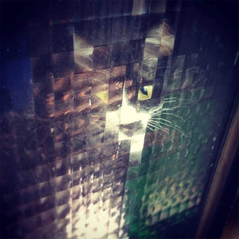 ▼讓貓咪待在方格玻璃後面,牠們瞬間就能點陣化,變成8位元版本。怪不得大家都說這是「馬賽克貓咪」,不用PS就有特效般的感覺。