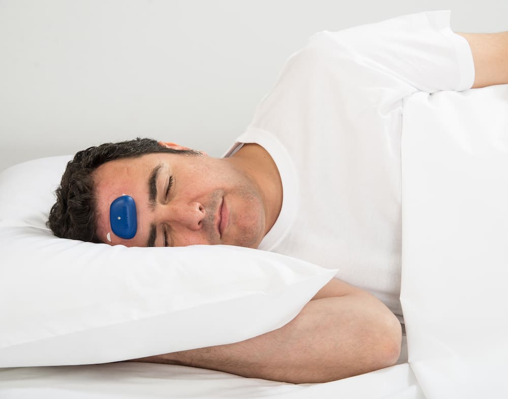 ▼由於睡眠時「仰臥」姿態更容易發出鼾聲,因此患者只要將這個 Somnibel 蜂鳴器貼在額頭前,當你在睡覺時翻身成為仰臥姿態時,設備就會開始振動,讓人在睡夢中自動轉換為「側睡」的姿態,從而減少睡姿影響而發出鼾聲。