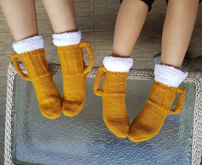 ▼先來看看這款超可愛的啤酒杯造型毛線襪。襪子做成了平時在美式餐廳中都能看到的超級啤酒杯造型。最特別的是,腳踝部分還有杯子把手呢~