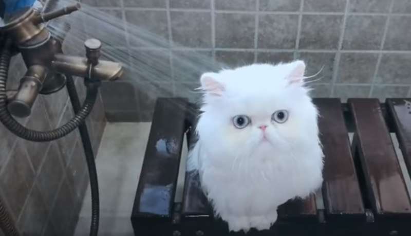 小白喵「第一次洗澡」居然很冷靜 淡定轉身直視蓮蓬頭:嗯,它在噴我