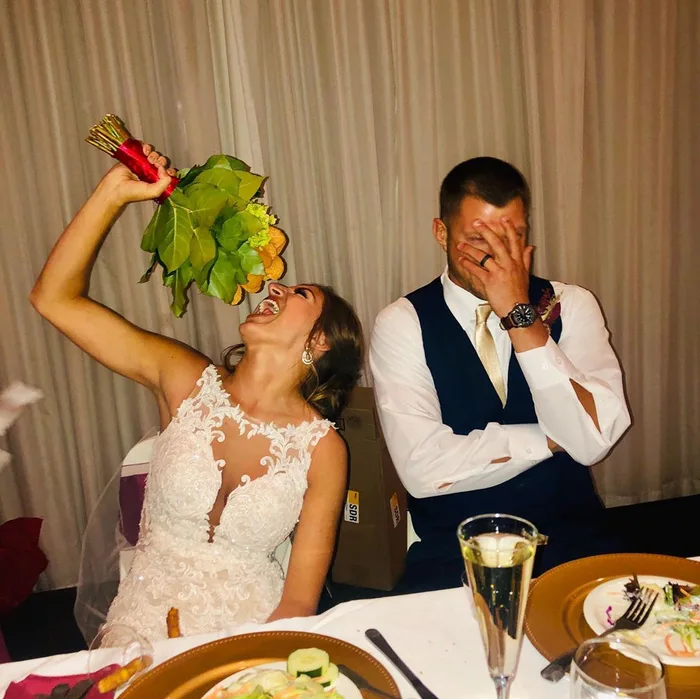 ▼美國新娘布萊爾(Blair Hardy)日前與老公亞當(Adam Tyson)完婚,但他們的婚禮卻倍受關注。布萊爾手上拿著不是花朵,而是一堆豎起來的雞塊!