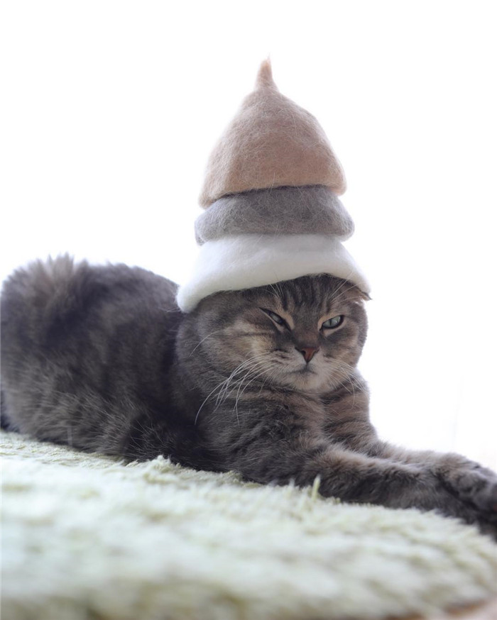 ▼三隻折耳貓擁有三種不同的毛色,每天在家中「處處留毛」,於是山崎良便把這些毛都收集起來,製作成各種形狀怪異的帽子,雖然每次給它們帶上都露出無奈表情,但誰讓「貓毛出自貓身上」,三小隻也只好無奈接受啦!