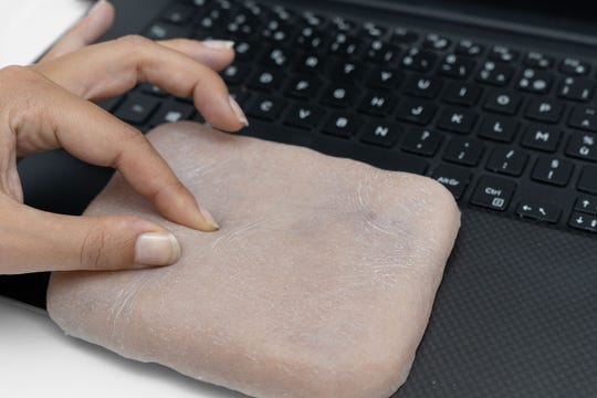 ▼這種「人造皮膚」保護殼一共分成三層,分別是兩層矽膠包覆著一層可拉伸的電磁銅線,讓這款保護殼除了模仿人體皮膚的觸感以外,也可以在筆電的觸控版上執行各種功能,完全不會有「卡卡」的感覺!