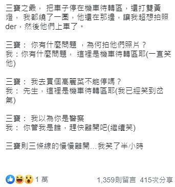 ▼不過當中最厲害的,還是這位將汽車停放在台北市和平東路三段路口的機車待轉格當中的車主,當他發現自己的車被拍照時,還大言不慚的表示「我去買個高麗菜不能停嗎?」厚臉皮的程度令人完全傻眼!