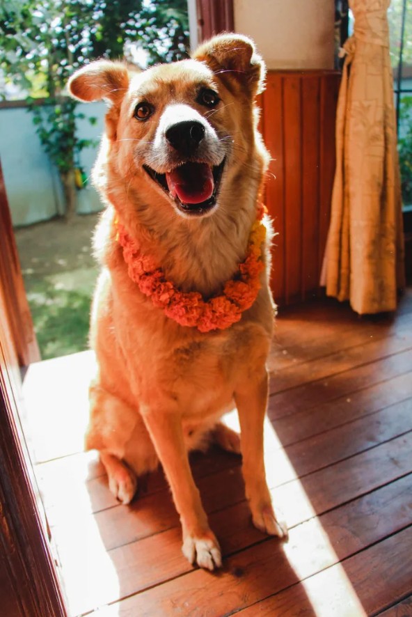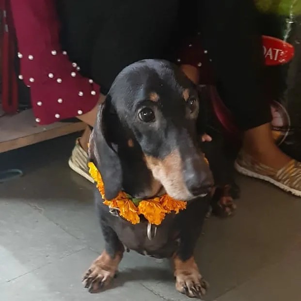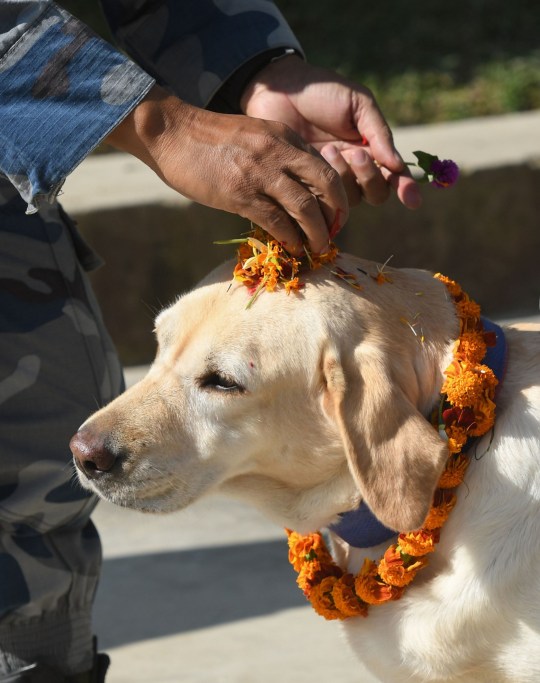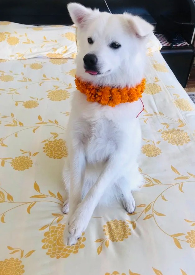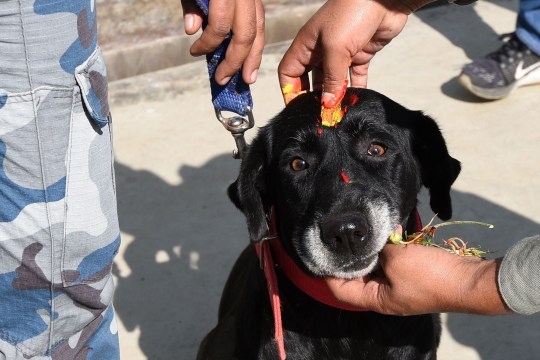 ▼尼泊爾人會幫狗狗在額頭前點上「蒂卡」(紅色標記)、戴上花環!