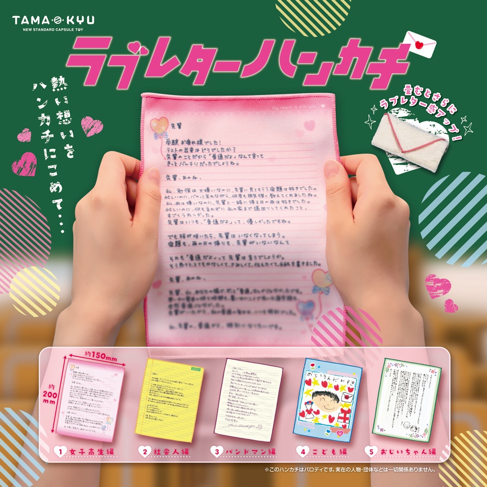 ▼Tama-Kyu預計在11月推出「情書手帕扭蛋」。這一系列扭蛋共有5款,有情書、小朋友給爸爸的畫像、公司高層寫給下屬的關愛信等等。