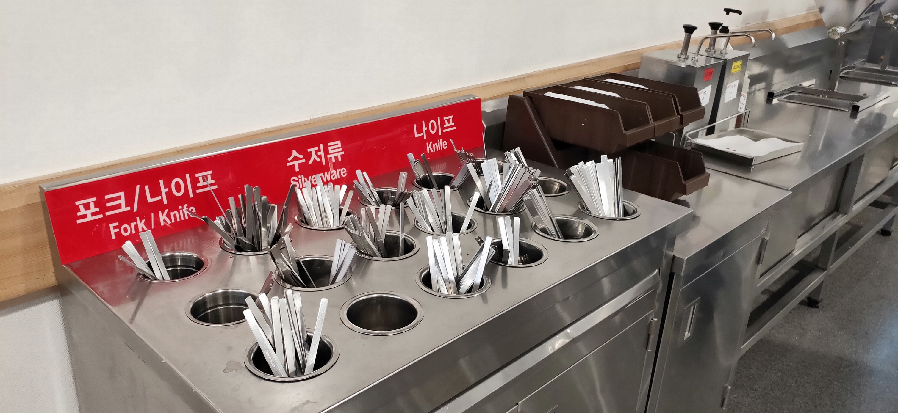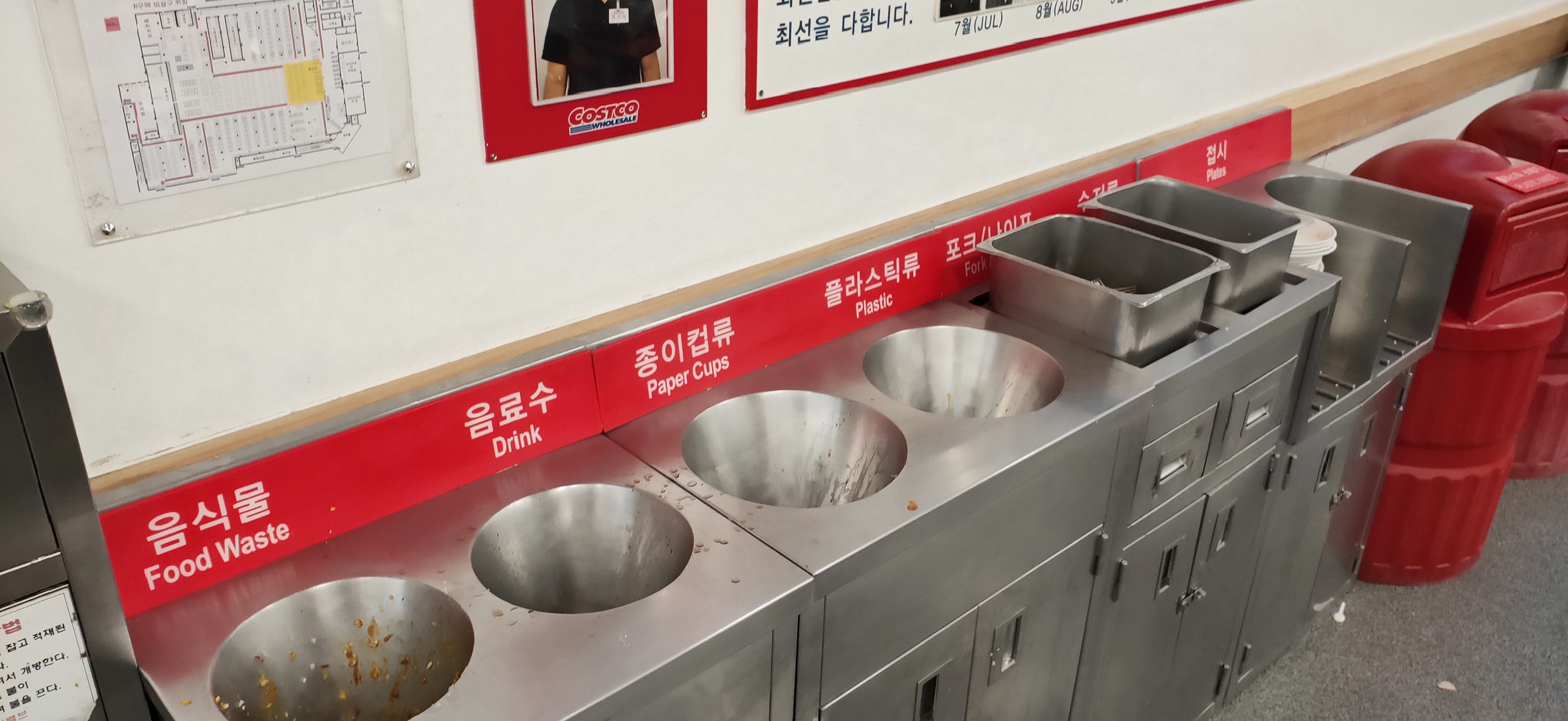 ▼在台灣Costco的用餐區,只有提供飲料機、醬料和配料可以無限供應,而在韓國Costco用餐區中,居然有提供非免洗餐具的櫃位,仔細觀察用餐區的民眾,大家用的餐具通通都是鐵製的,就連廚餘桶也是鐵製統而非塑膠袋,讓不少網友大讚「環保又衛生」!