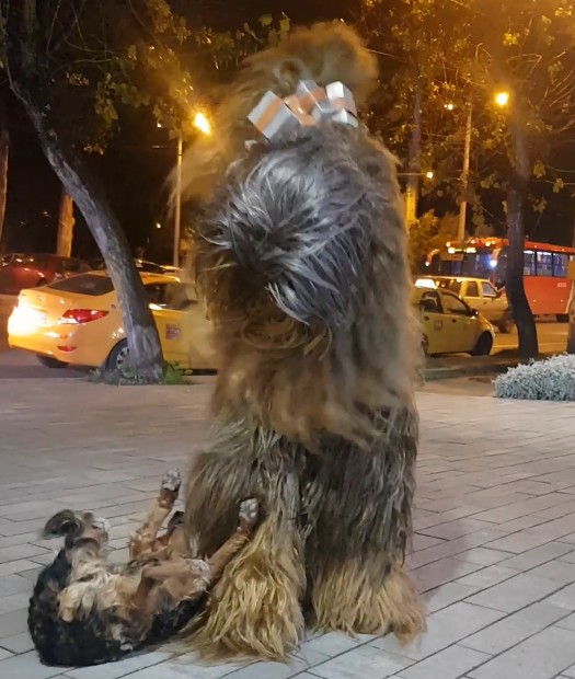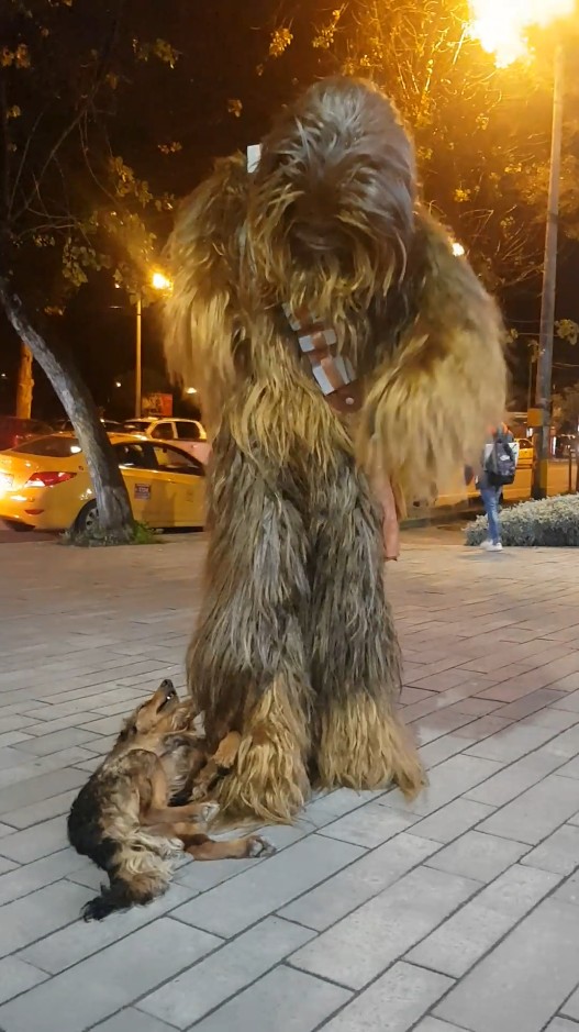 ▼最後狗狗還直接躺在了「丘巴卡」的腳邊不肯離開,這暖心的一幕全都被路人用手機拍了下來,分享到網路上後讓這隻狗狗瞬間一夜成名!
