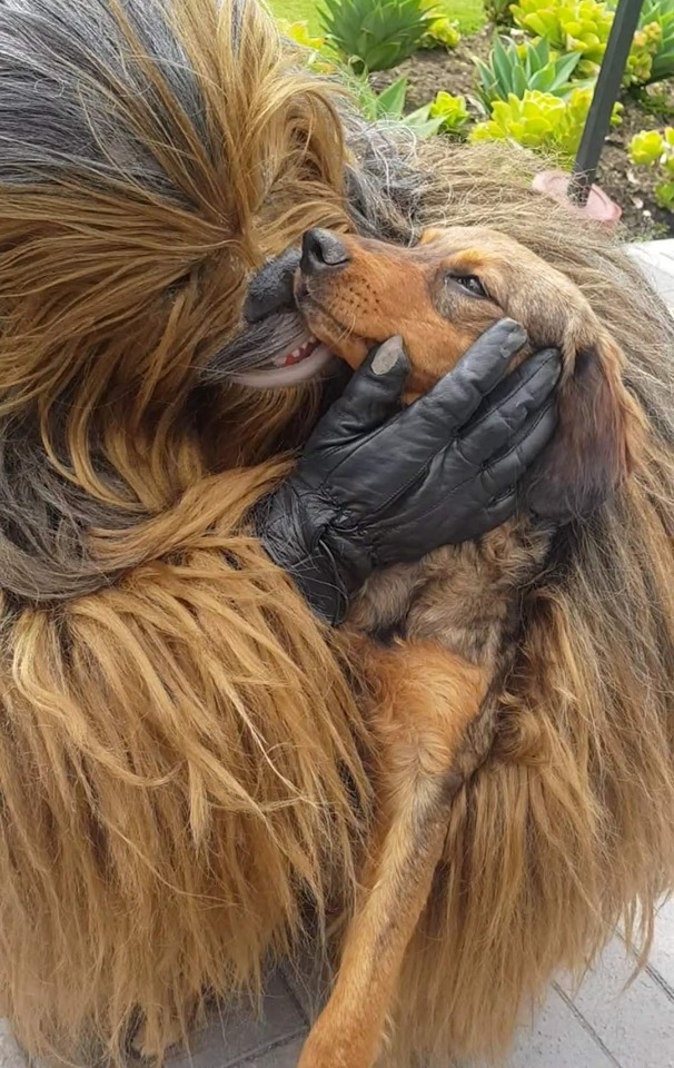 狗狗遇見毛絨絨的「丘巴卡」時展露出的模樣是不是非常可愛呢?那興奮的模樣仿佛遇到了自己心目中最崇拜的偶像一樣。也許是因為那活潑的特徵讓牠吸引了大家的注意,牠最後終於得到了一個幸福的歸屬!