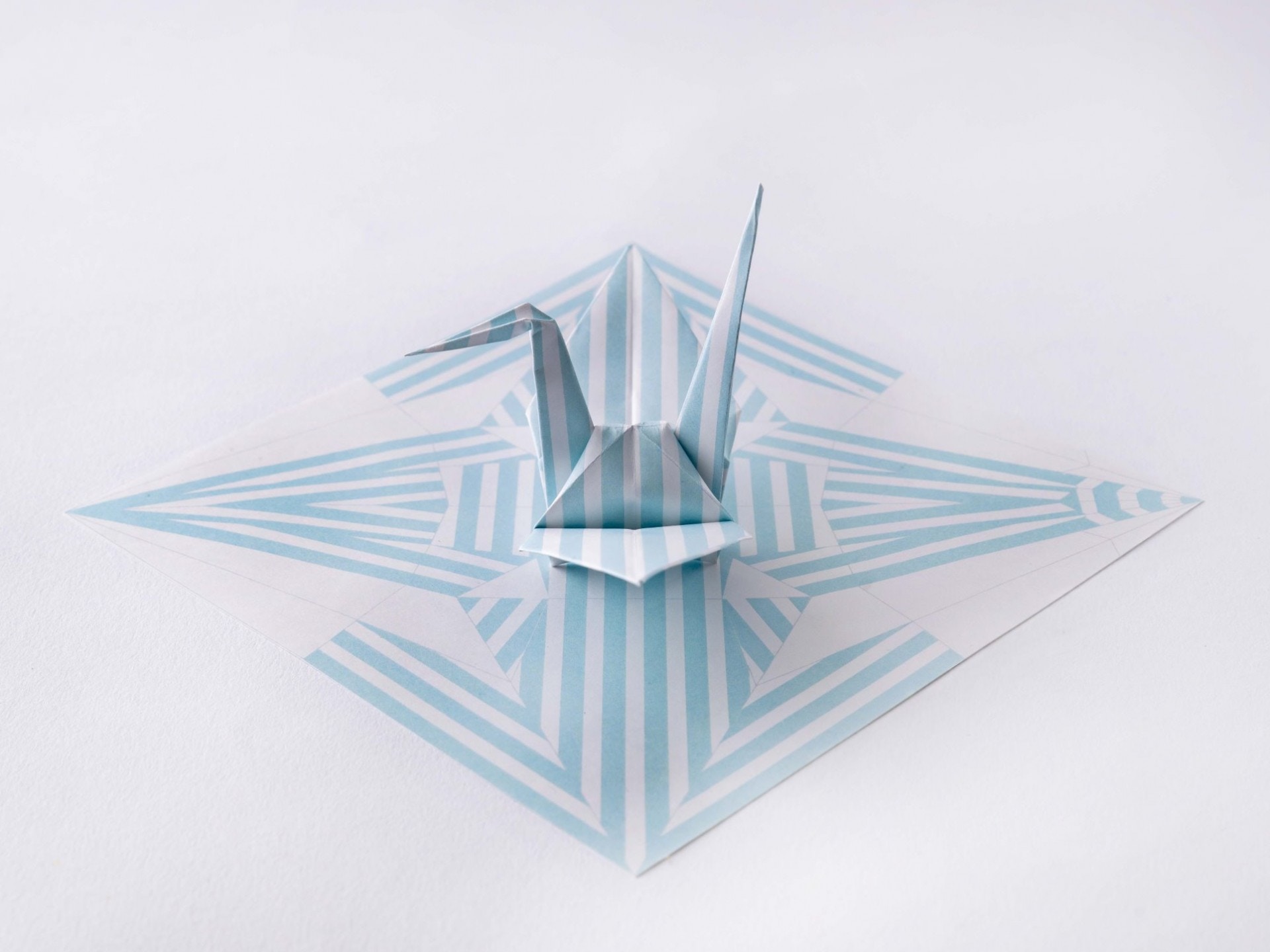 ▼摺紙平鋪時呈現出複雜的條紋圖案,疊成一隻紙鶴後,所有的條紋都會整齊劃一地碼好。整張摺紙就像一個謎團,只有疊好後,謎底才會浮出水面。