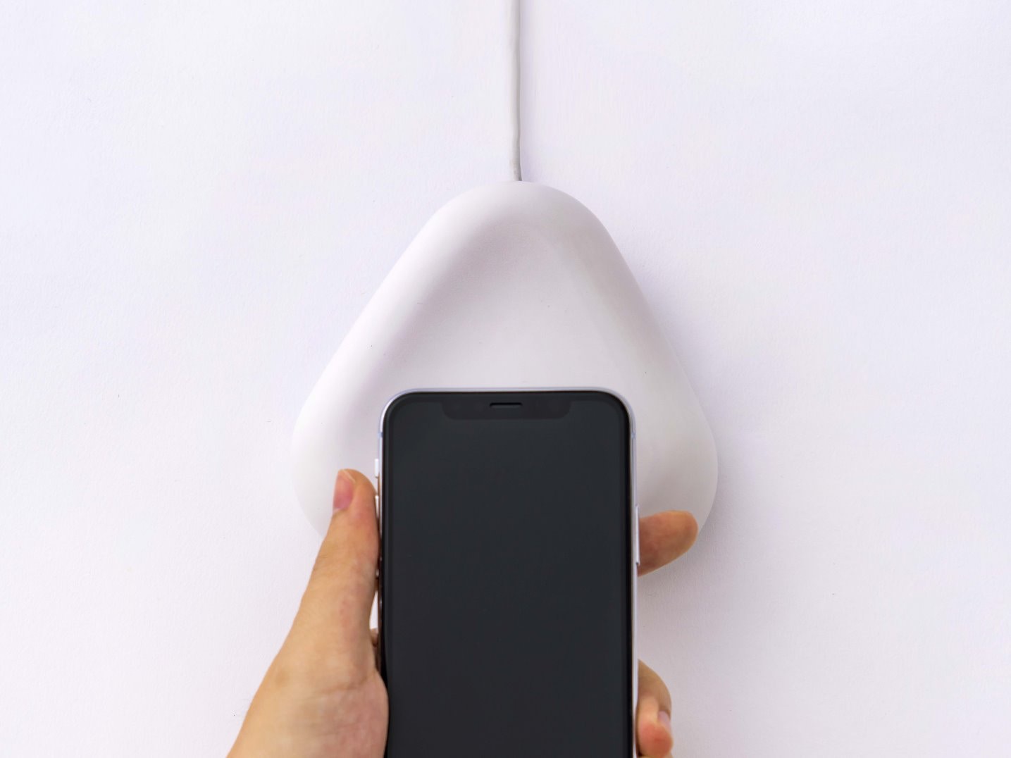 ▼他們設計了一款圓潤的白色三角形,把黑色的智慧型手機放上去,看起來就像一個「飯糰」,非常可愛。這就是電子支付的NEXT STANDARD。