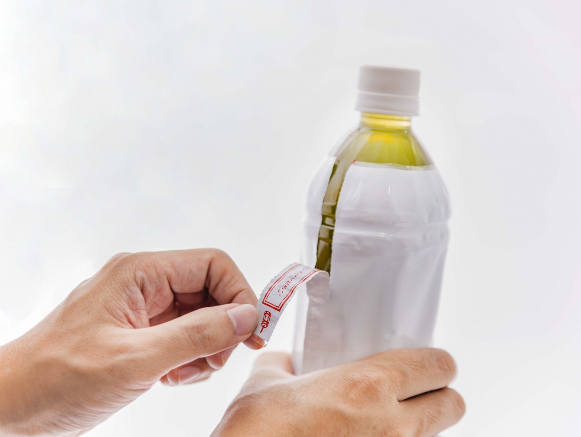 ▼2.北浦俊、吉田隆大設計的礦泉水瓶包裝紙。在日本扔掉礦泉水瓶,要先把瓶蓋擰下來,再取下包裝紙,最後將蓋子、包裝紙、瓶子分別扔進不同的垃圾桶。但很多人覺得麻煩,不會分解得這麼詳細。