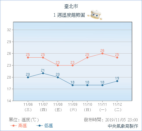 ▼中央氣象局也提醒北台灣氣溫開始有下滑趨勢,周六輻射冷卻影響,最低溫可至17~19度。