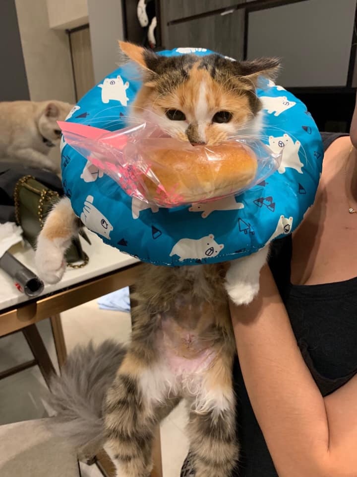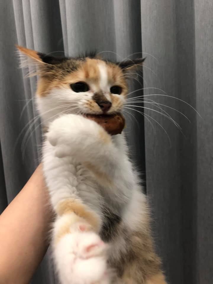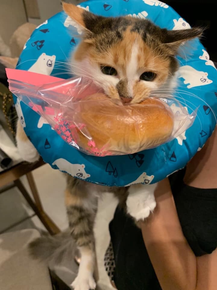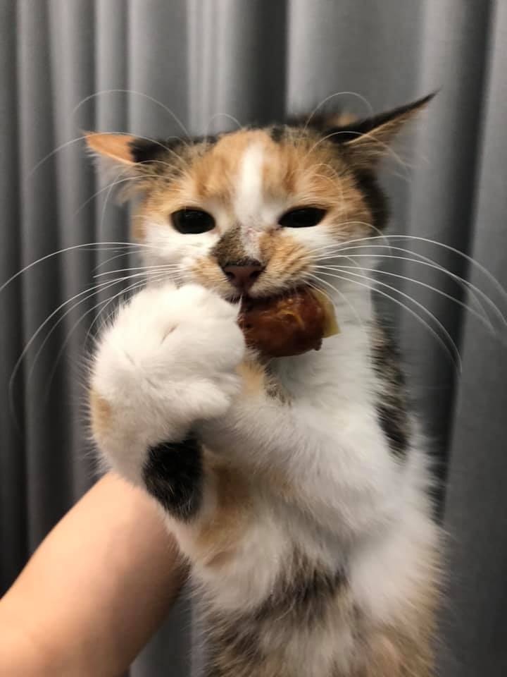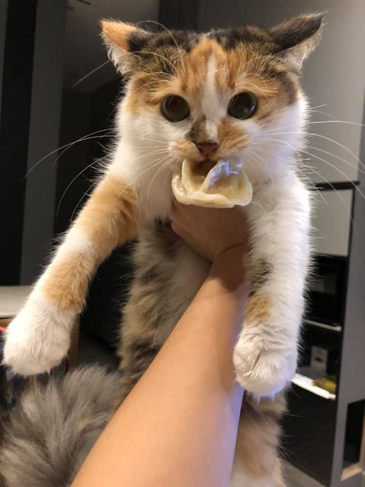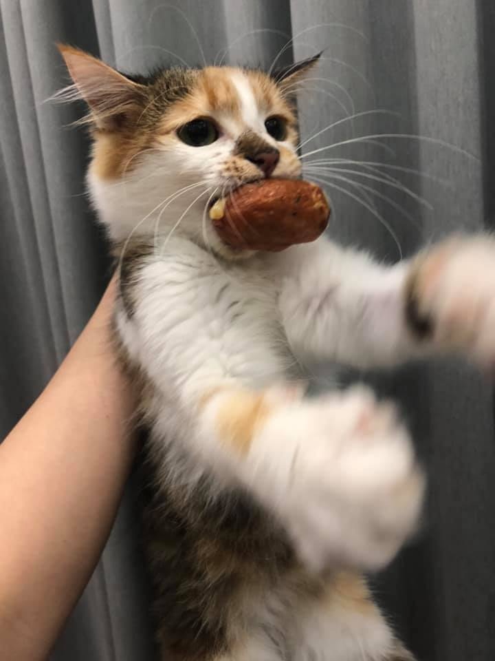 ▼這隻貓咪非常愛吃,最喜歡挑大件的食物來偷吃。甜米糕、蛋餅、貝果,還有湯裡的貢丸,牠對美食真的很執著。