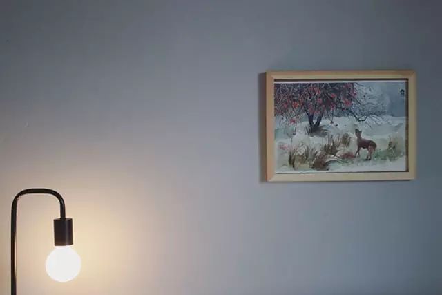 ▼卧室中有一些原木材質的小件物品。再把之前的水彩作品裝裱起來,掛到牆上。