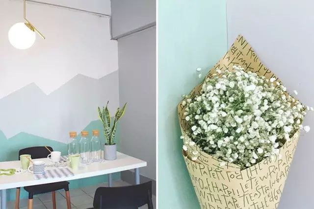 ▼餐廳牆面用簡單的幾何色塊裝飾。淺淺的的薄荷色看起來很清涼,給人一種眼前一亮的感覺。