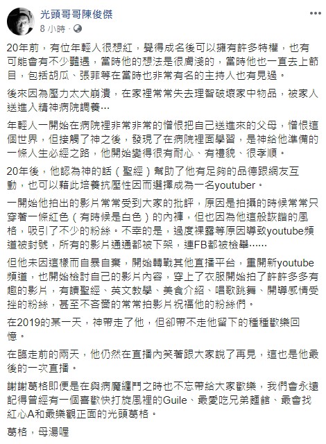 ▼光頭哥哥粉絲團的小編,也在臉書發文緬懷光頭哥哥的過去,也透露過去光頭哥哥因思覺失調,而住進精神院中。後來他靠著接觸宗教而改變了想法,終於成為了受到大家歡迎的直播主!
