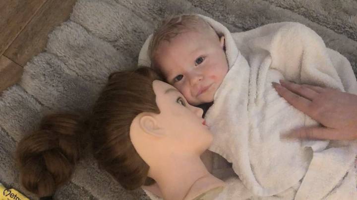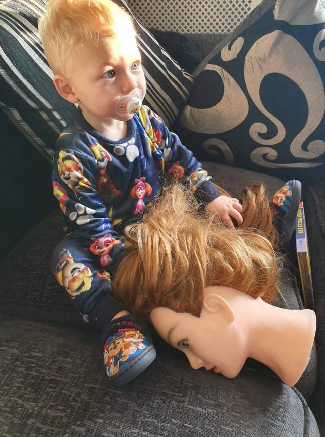 很多寶寶喜歡抱著毛茸茸的玩具入睡。英格蘭巽德蘭(Sunderland)的一位媽媽非常苦惱,因為她14個月大的兒子超愛假人頭,不管吃飯還是睡覺都要抱著它。小寶寶與人頭的組合看起來太奇怪,家裡人都被嚇到了。