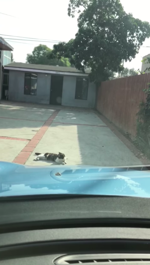 ▼奴才移走Cachetona後回到車裡,剛準備好好停車,家裡的另一隻喵星人Nina又跑到車道上躺了下去。這攔在路中間的霸道模樣,明顯是想讓奴才跟移走Cachetona一樣,將自己也移開。