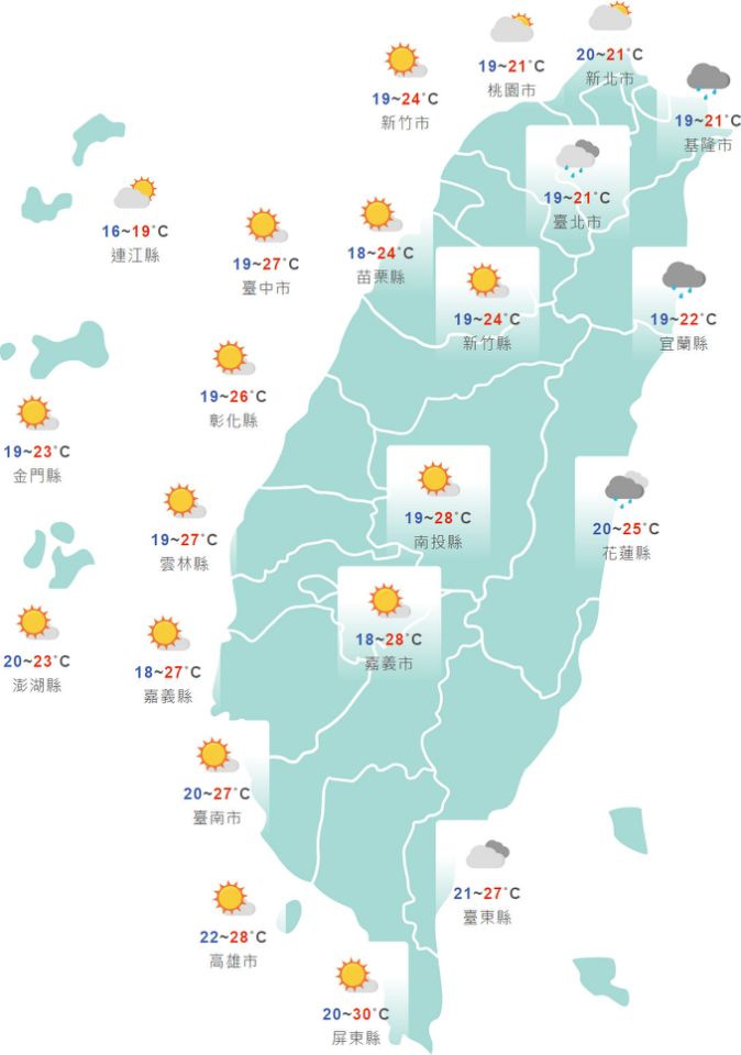 ▼明天開始一直到週六,中部以北部分地區清晨低溫都有機會出現15至16℃低溫,西半部與東北部大部分地區約16至18℃、南部約17至19℃、花東約19至20℃。
