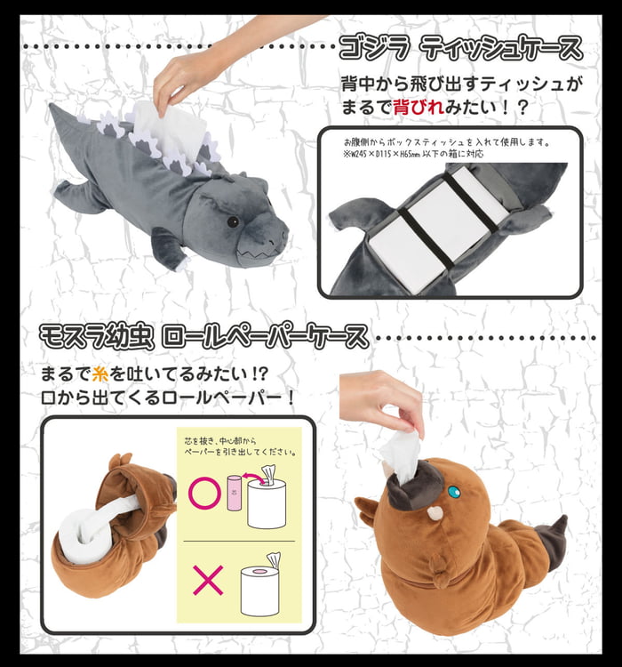 2019年11月27日哥吉拉系列電影的第一部作品在1954年上映,如今已經過去65年,這隻潛藏海底的太古怪獸仍舊人氣超高。日本SUN-STAR文具公司推出了一系列怪獸主題的衛生紙套,包括哥吉拉和摩斯拉幼蟲造型,看起來竟然很可愛。