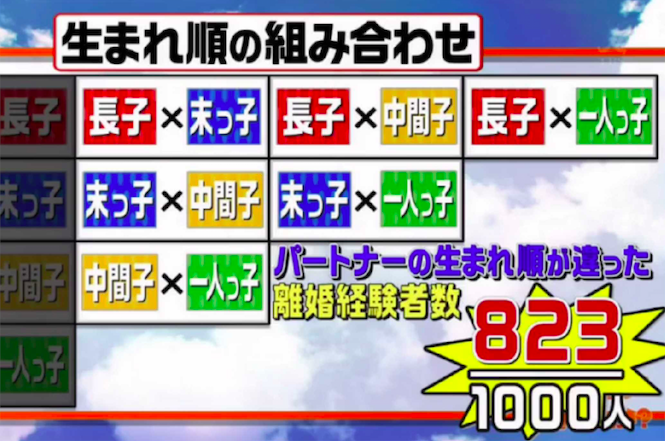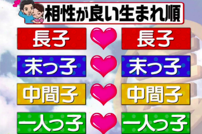 ▼最匹配的組合是什麼呢?五百田達成先生表示,戀愛時人們喜歡追求自己身上沒有的特質。但結婚是要跟另一個人長久相處,如果差別太大,很容易產生磨擦。所以最匹配的對象應該是跟自己在家中排行相同的,也就是長子配長子、老么配老么。