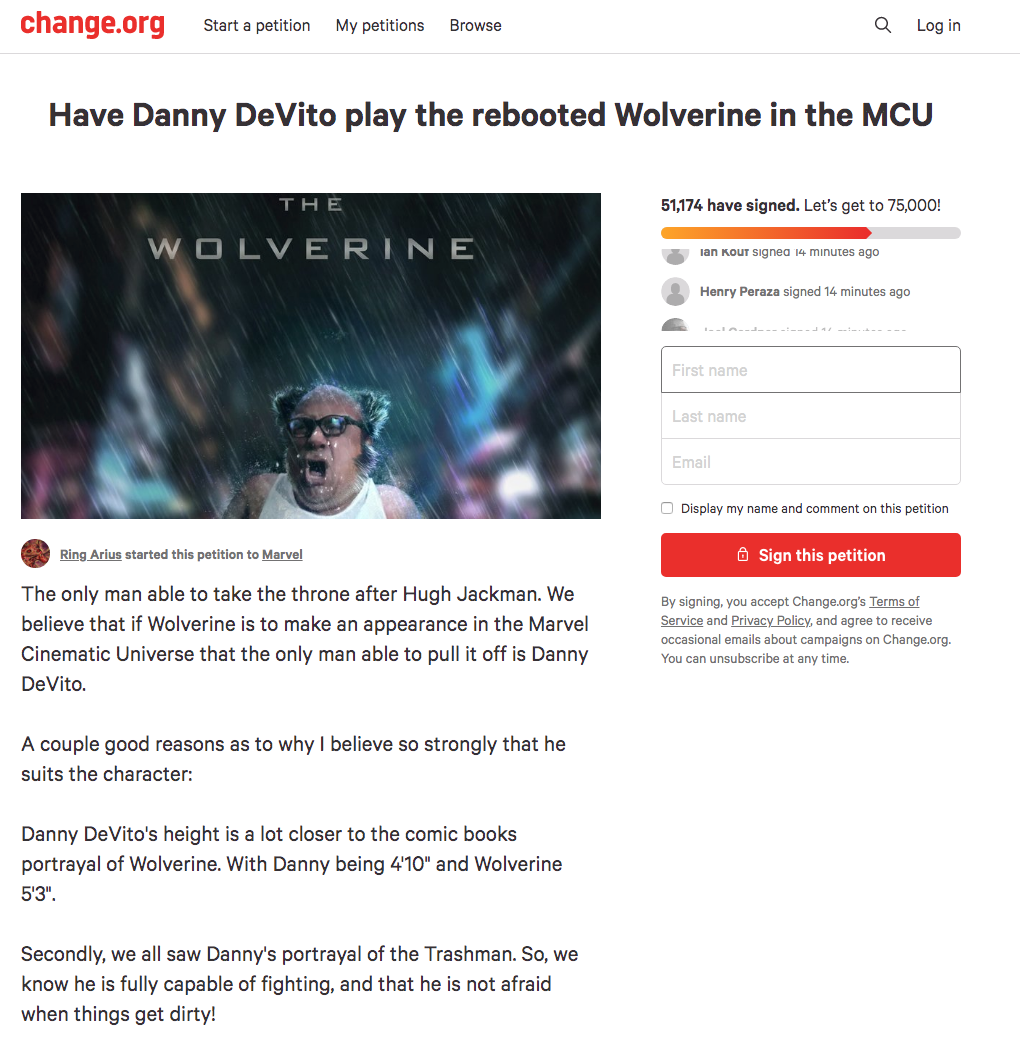 2019年11月28日雖然休傑克曼(Hugh Jackman)不再飾演「金鋼狼」這個角色,但是他卻在兩年前就預言過金鋼狼並不會就這樣消失,反而會再出現大銀幕上!官方至今依然還沒有公布新人選,但是網路上已經有網友發起連署,熱烈推薦74歲的丹尼狄維托(Danny Devito)接棒!