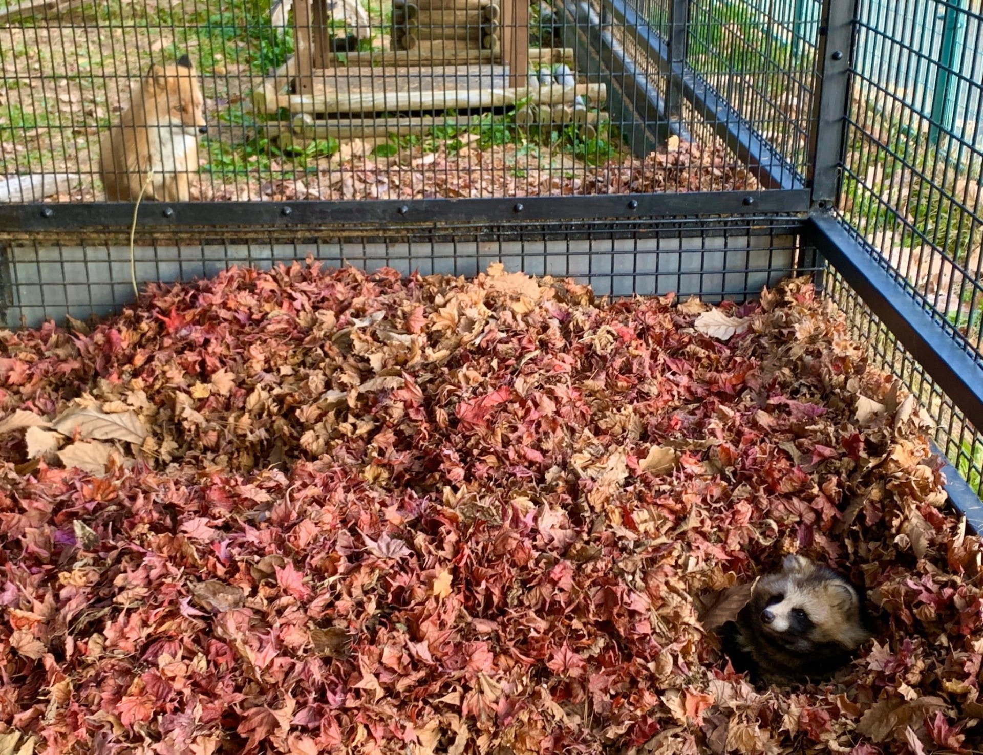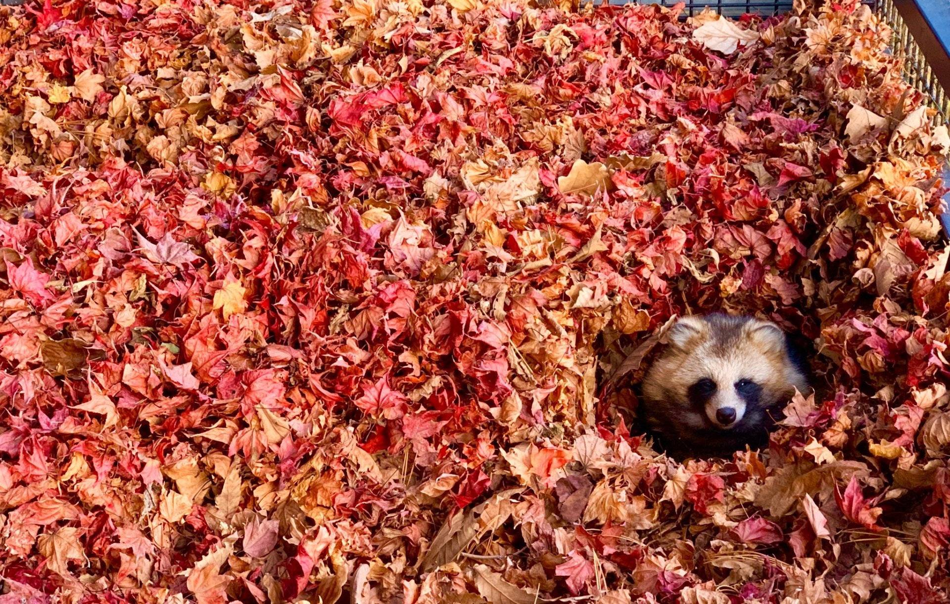 ▼因為浣熊太喜歡紅葉,動物園的工作人員特別在浣熊區準備了小山丘一般高的紅葉堆。