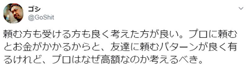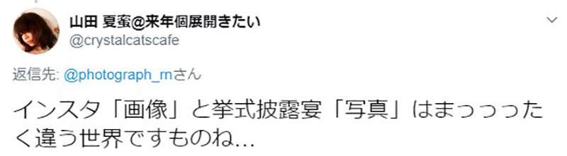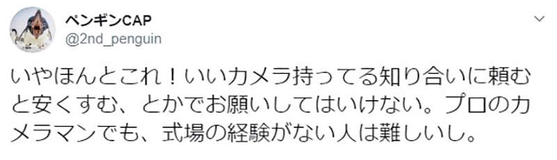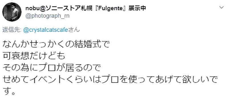 ▼藤崎延明也認為,在這種一生之中的大事,有著絕對不能夠搞砸的壓力,不過就連專家也不能保證不會失誤,更何況是一般的攝影師?因此「拜託朋友拍照的新人」和「接下拍照任務的朋友」都需要特別檢討。他也在推特中回文表示「重要的婚禮搞成這樣的確令人不開心,不過職業攝影師就是為此而存在的,希望大家在辦活動的時候,能夠想到職業攝影師啊!」