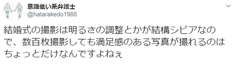 ▼藤崎延明在推特中表示,「『婚禮攝影想拜託丈夫一個有單眼相機的朋友來拍,他的IG都是超厲害的照片,只要1萬日圓就可以幫忙太神了!』原本這麼說的新娘後來向我報告收到的照片令人完全傻眼,這是2人下的決定也沒有辦法,所以說婚攝才沒那麼簡單啊!」