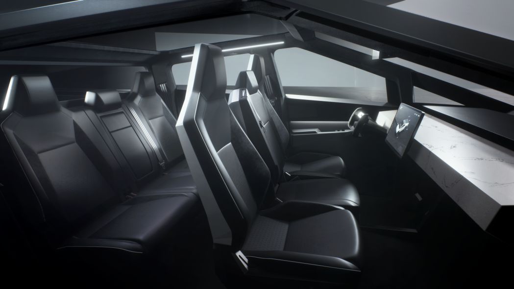 ▼Cybertruck 皮卡可承載6名成人,內部裝飾也採用了特斯拉一貫的極簡設計,儀錶板也將顯示在中央的17吋的觸控螢幕上。