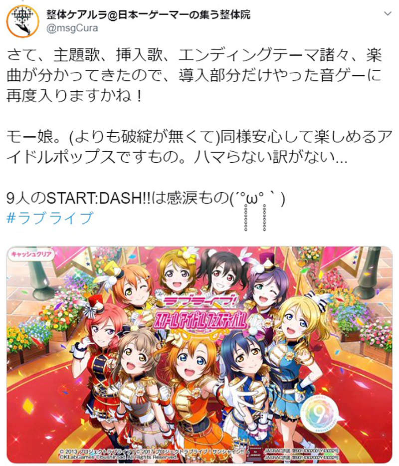 2019年11月29日日本東京一間整體店「整体ケアルラ」的老闆成為網路話題,因為他居然為了追看經典的偶像動畫《LoveLive!》而決定提早關店追動畫!客人走到店門口看到牌子上寫的內容都當場傻眼貓咪。