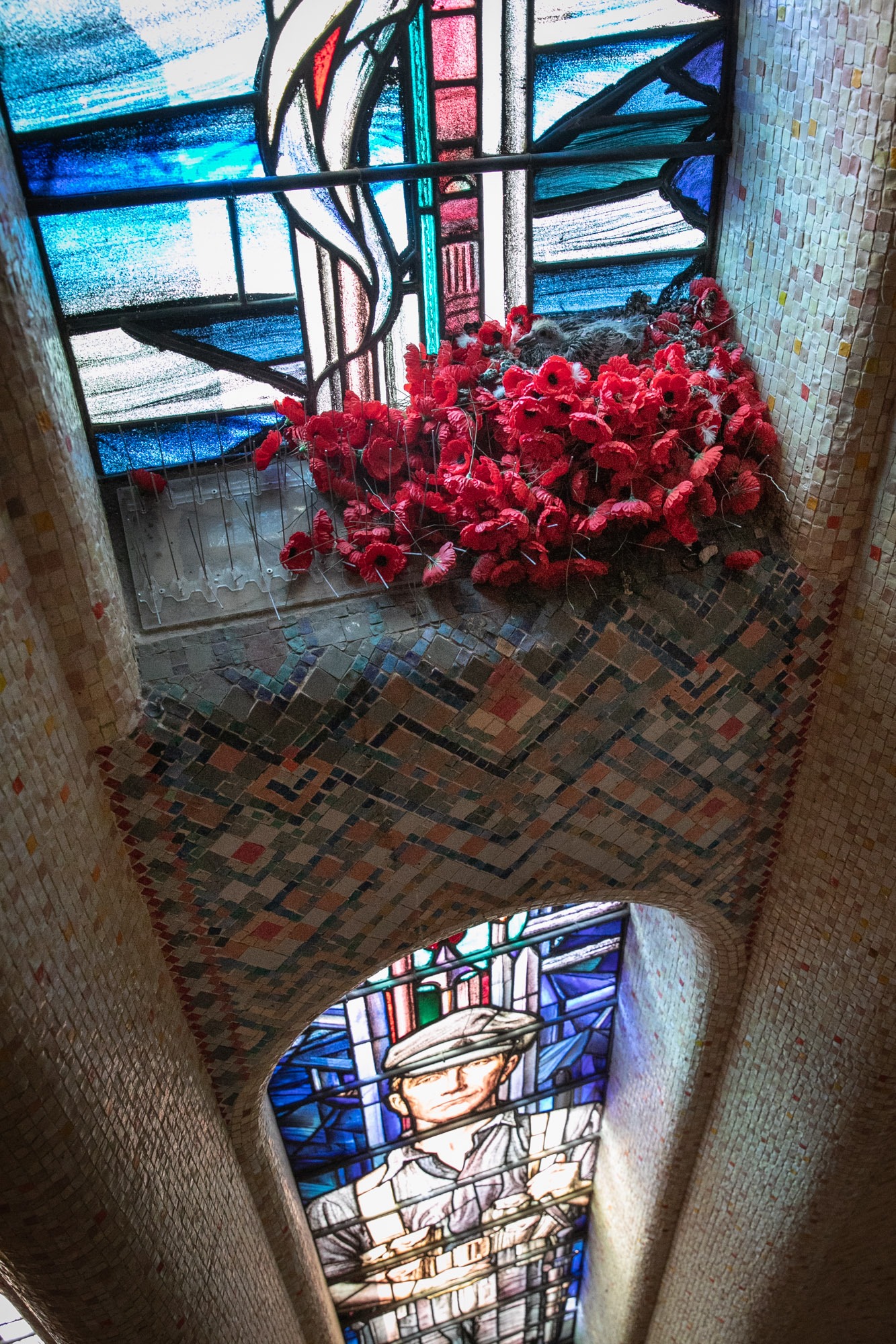 ▼後來,紀念館的維護人員在高處的彩繪玻璃上,發現了一個以罌粟花做成的窩!這才知道,原來是被鴿子選中當做窩的材料了啊~