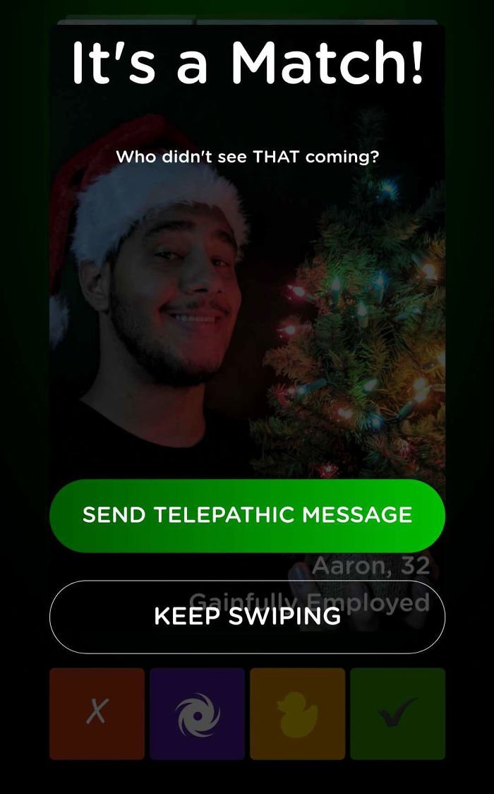▼當有女生使用者按下綠色勾勾之後,App 馬上就會顯示「配對成功」,並且鼓勵女生向亞倫傳送私訊,提高交友的成功率!