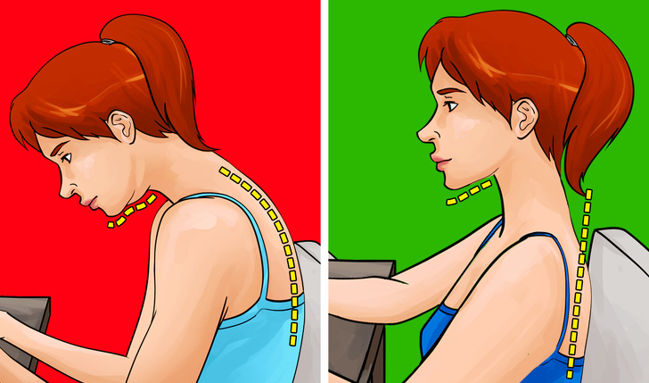 ▼1.調整坐姿:坐姿不良不僅會影響脊椎,還會影響面部。每天弓背彎腰,久而久之頸部和麵部的肌肉就會變得鬆弛無力。平時在辦公室工作記得挺直腰背,把電腦螢幕墊高一點,這樣就不會一直低著頭了。