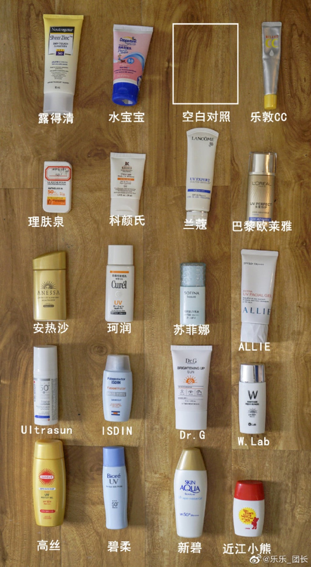 ▼美妝師「樂樂_團長」蒐羅了19種市面上知名品牌的防曬乳,並留下一組不擦的對照組,然後找來了一位男生做實驗…等等,只有一個人要怎麼實驗19種?